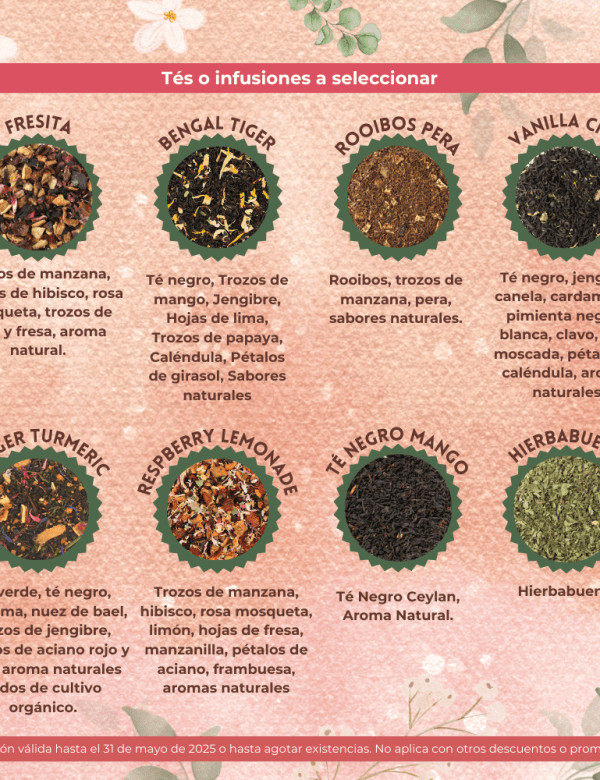 - Variedad: Selecciona los tés que más amas y sorpréndete con nuevas combinaciones que ofrece la Promo Mayo x 2.