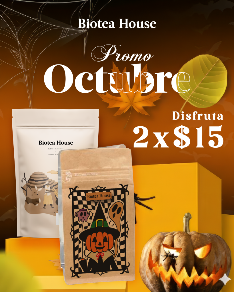 ¡Celebra este mes de Halloween con nuestra Promo Tés Octubre x 2! Al igual que nuestra popular Promo Tés Septiembre x 2, esta oferta especial te permite elegir dos infusiones o tés deliciosos de nuestra cuidadosa selección, perfectas para llenar tus tardes de sabor y calidez.
