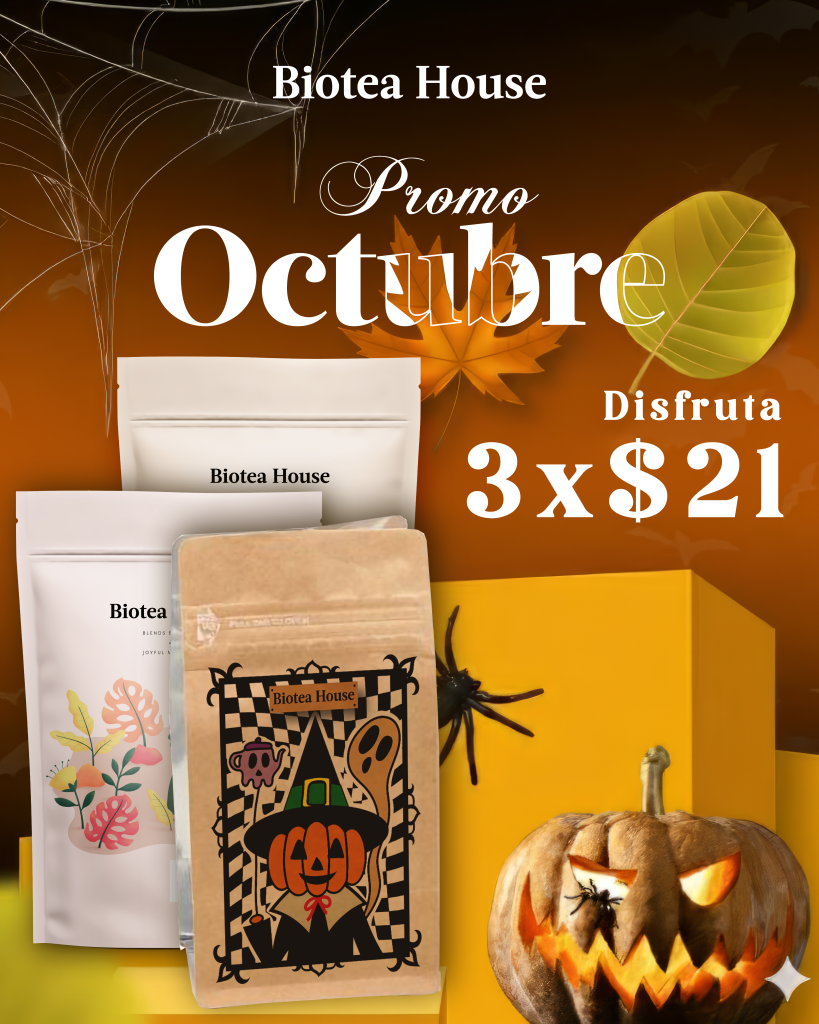 ¡Celebra este mes de Halloween con nuestra Promo Tés Octubre x 3! Además no olvides que nuestra oferta del mes pasado. Esta oferta especial te permite elegir tres infusiones o tés deliciosos de nuestra cuidadosa selección, perfectas para llenar tus tardes de sabor y calidez.