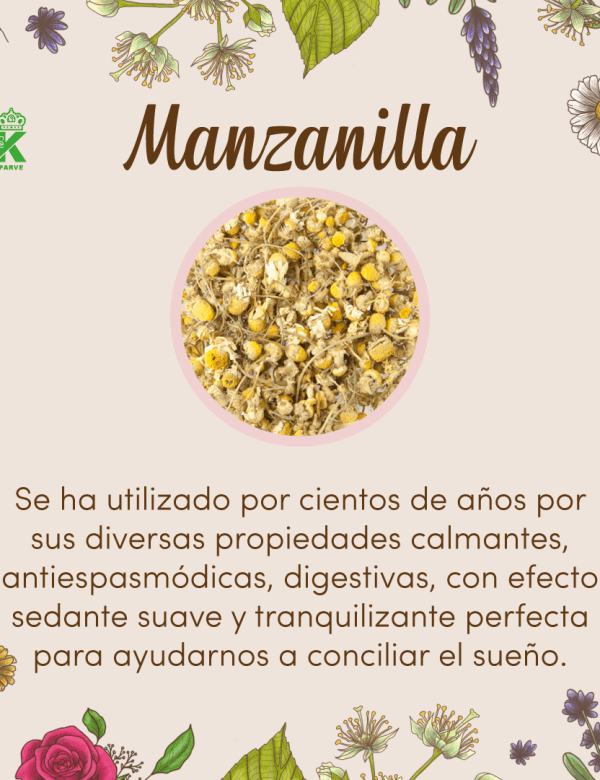 - Manzanilla (30g): Conocida por sus propiedades relajantes, es el complemento ideal para cualquier momento de calma.